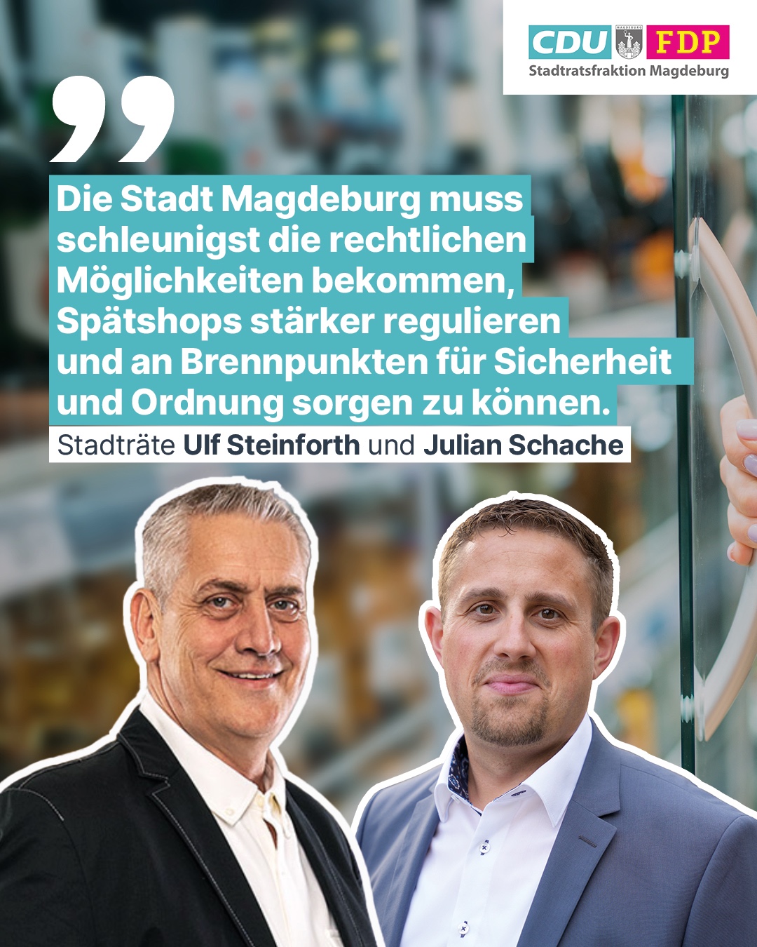 Die CDU/FDP Stadtratsfraktion fordert, dass die Landeshauptstadt Magdeburg künftig Öffnungszeiten einschränken oder nächtliche Alkoholverbote aussprechen kann – dort, wo es immer wieder zu Lärm, Müll und Konflikten kommt.