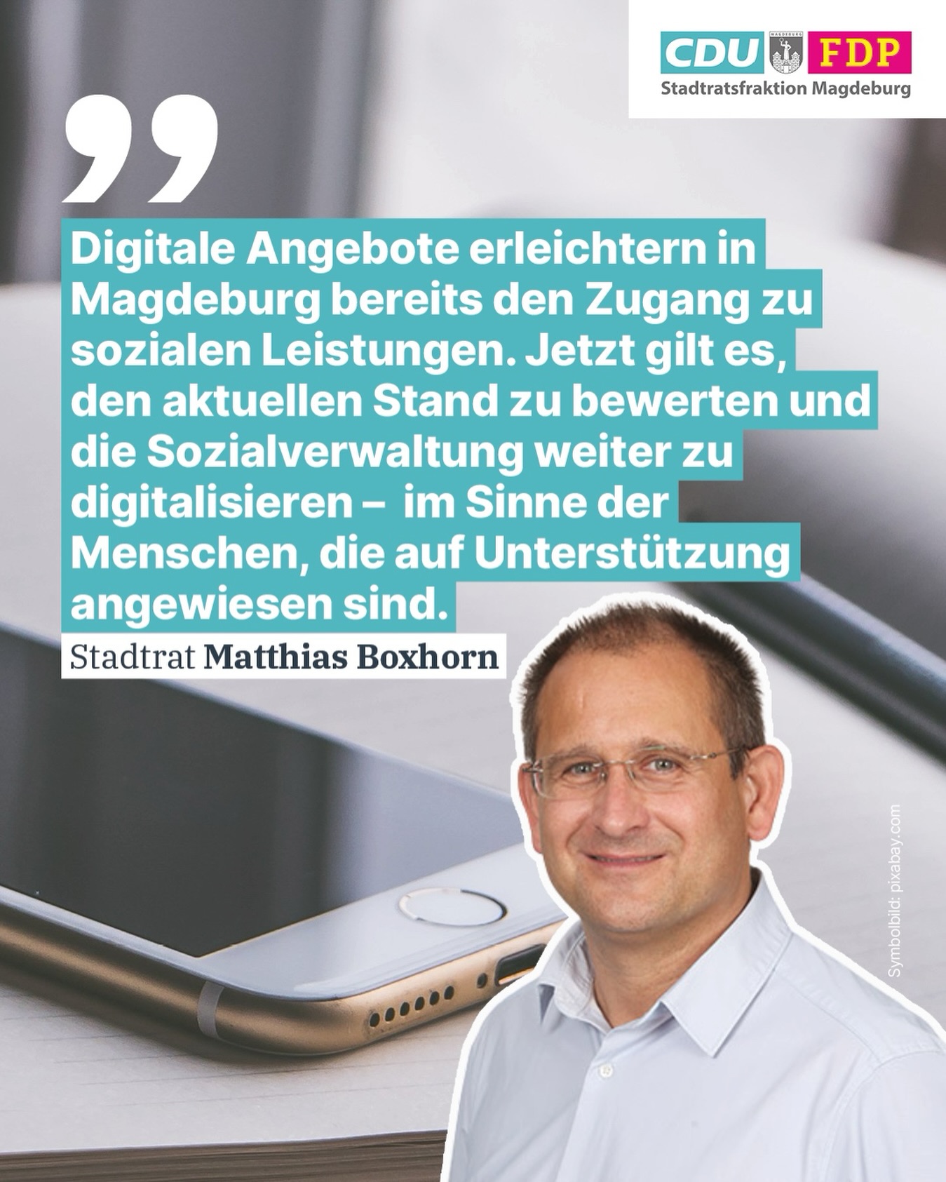 Stadtrat Matthias Boxhorn erklärt dazu: „Ziel ist es, die Serviceorientierung weiter zu stärken und digitale Angebote dort auszubauen, wo sie den Menschen, die auf Unterstützung angewiesen sind, konkret helfen."